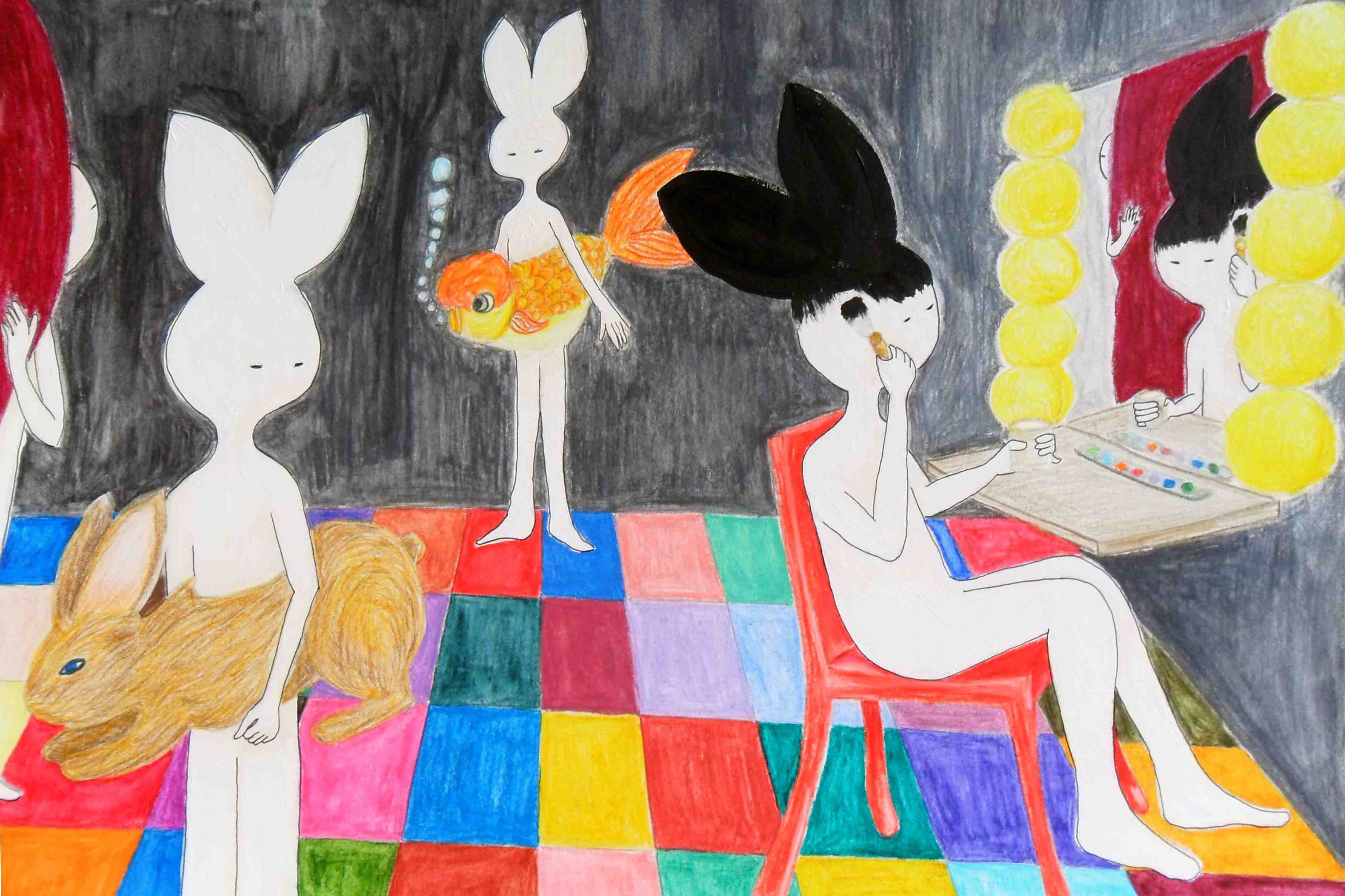 起初,Rabbit-Man 是又肥又矮,有嘴巴,没有手指的,我一直畫了約一年多才形成到現在的形態。他有幾個朋友,金魚、樹懶和蝸牛,現正在畫關於他們的四格漫畫。