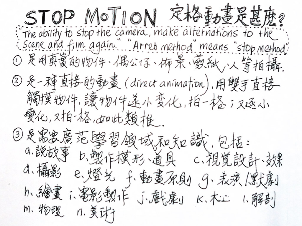 定格動畫 (Stop Motion) 是由頭到腳的身體運作,去拍攝真實的空間、地心吸力的限制、物件及燈光。拍攝是運用一種straight ahead的過程,因此拍攝定格動畫常會勞累。動畫的時間觀跟現實的時間觀很不同,現實的一秒是一秒,動畫的一秒可用上一小時或更多時間完成,從拍攝動畫後回去現實,感覺會很超現實。