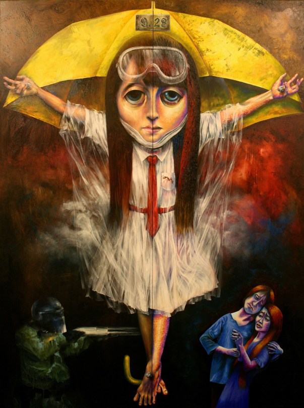 雨傘人, 淋漓、淋浪, 油畫組件兩幅 – 左: 淋浪 右: 淋漓 油彩布本 150x200cm 2015 April 7, 2015 1000 × 1344 They are artists: 淋漓 淋浪 雨傘像十架 是政治的刑具 更是犧牲的光輝 ——送給被打過,被捕過,一起撐過的你們。